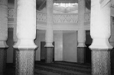 Здесь можно снять обувь, переодеться и подготовиться к молитве. В этих залах представлена исламская литература, лежат священные книги мусульман. Прямо — проход в главное помещение для молящихся размером 15 х 10 м. Мраморный пол устлан коврами. Своды молитвенного помещения держатся на шести столпах — колоннах, украшенных накладной резьбой. На внутренних стенах мечети под куполом устроены два яруса галерей для женщин-мусульманок. Прямо от входа в зал находится михраб, указывающий направление к Мекке. С правой стороны от михраба расположен минбар — кафедра, с которой читаются проповеди. Весь молитвенный зал мечети, колонны, своды, галереи, балконы обильно украшены белой накладной резьбой и орнаментом. Под потолком молитвенного зала подвешена большая хрустальная люстра, выполненная в форме мусульманского полумесяца. Зал оборудован радиоаппаратурой и динамиками.